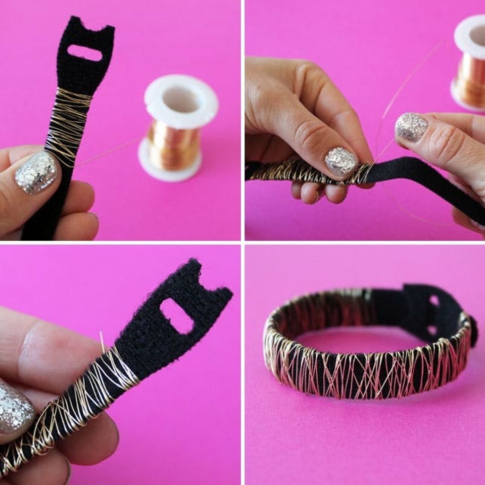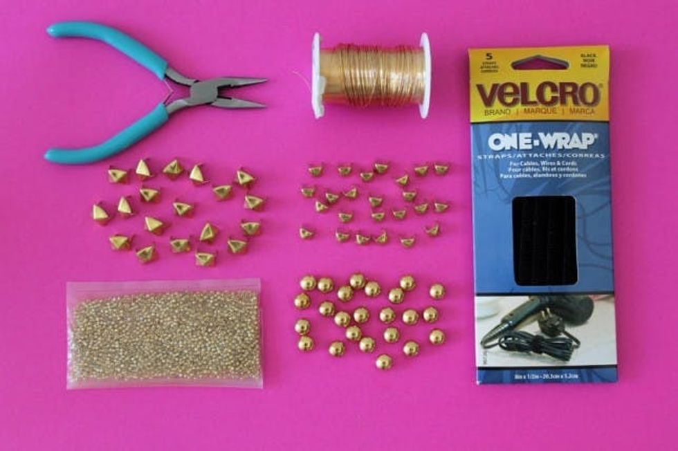 Press your studs through a black VELCRO® Brand ONE-WRAP® Strap and use pliers to secure on the inside. You want to make sure the loop side (aka the soft side) is the one facing your wrist. Continue around the whole wrap and you’re done.