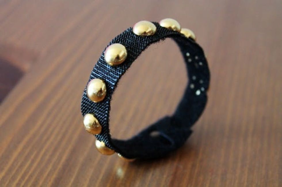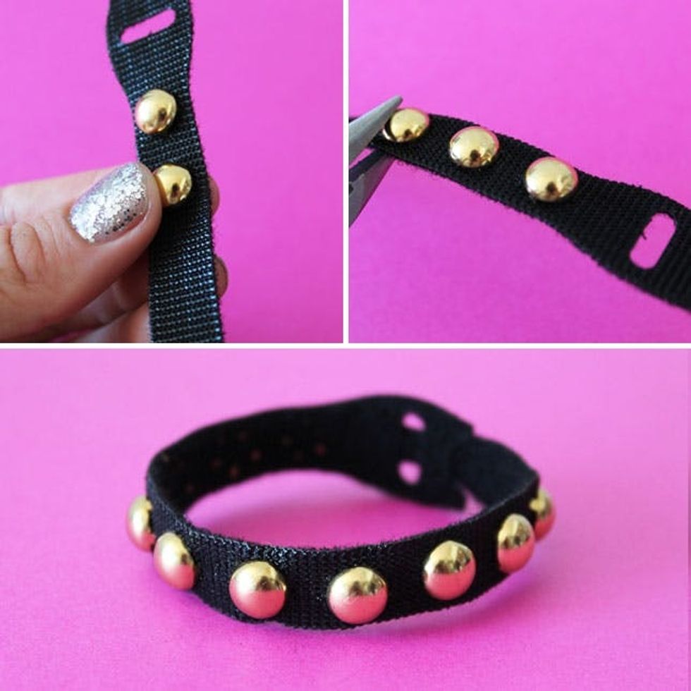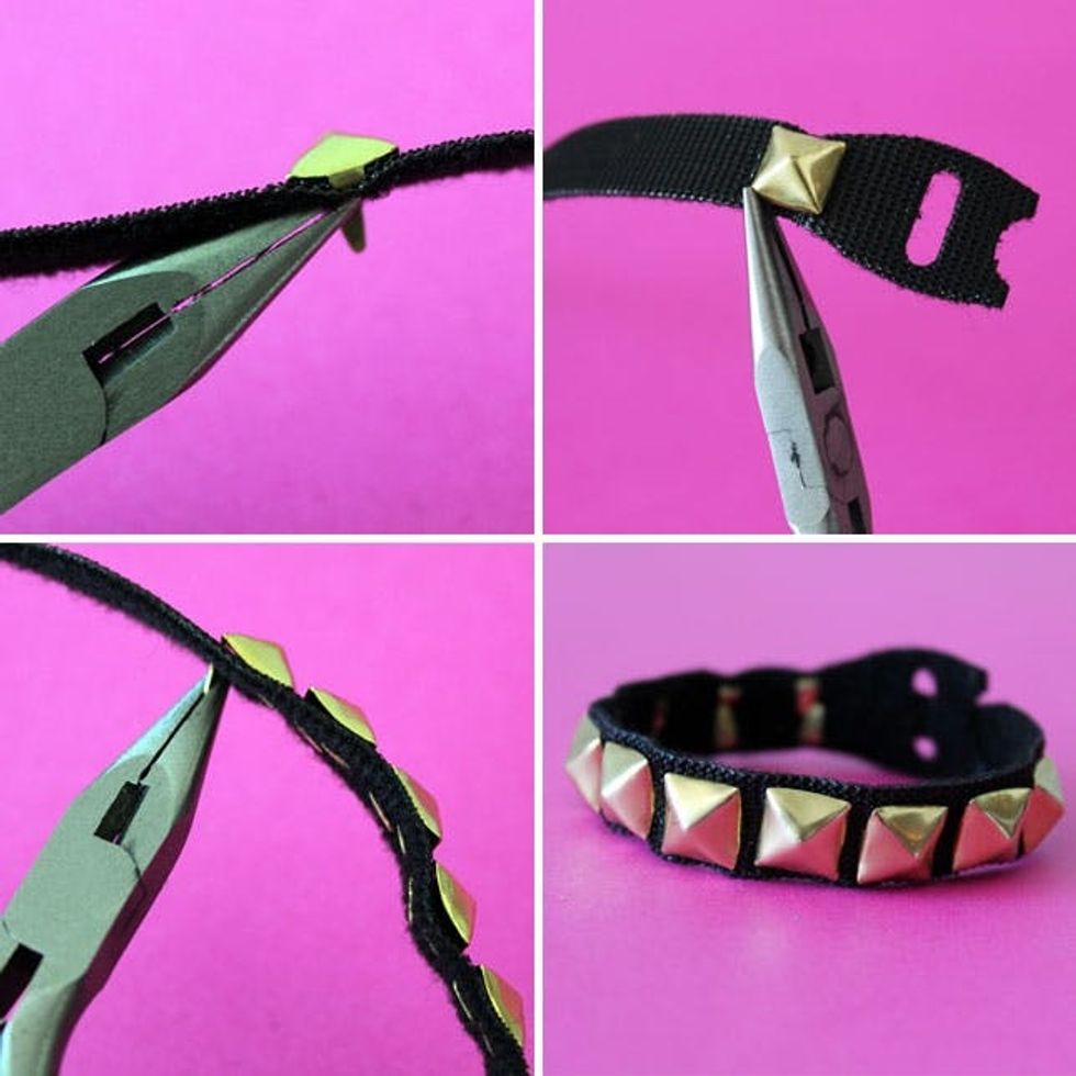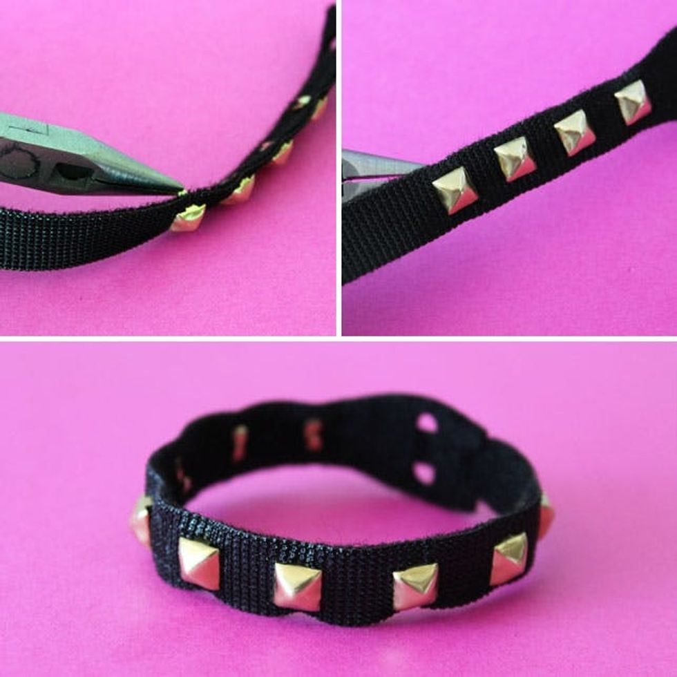 The process for this is exactly the same as the first studded bracelet. Press studs through the strap, use pliers to secure, and wear!
