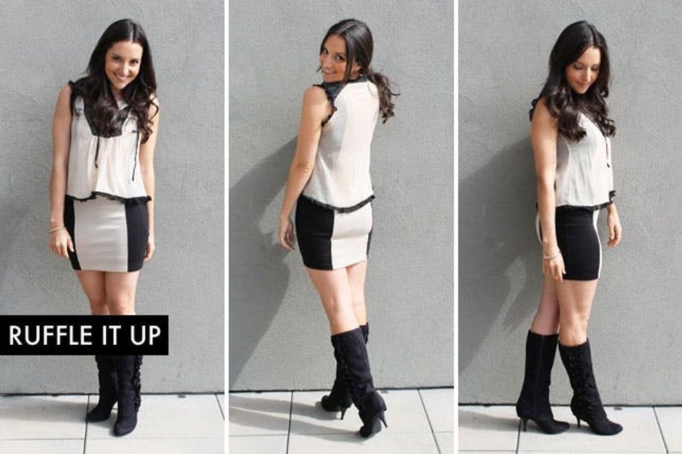 To give your dress a softer more romantic look, ruffle it up! We layered a slightly sheer lacy hippie top and paired it with ruffled suede boots. Definitely gives this beige and black look a softer vibe.