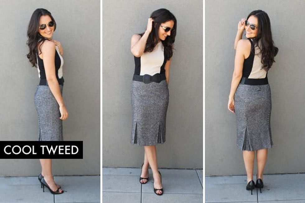 If you want to earn some style points, it’s all about adding a few gorgeous pieces. An airy white sweater, bold belt, and stripy heels take this dress from standard to uber-sophisticated.
