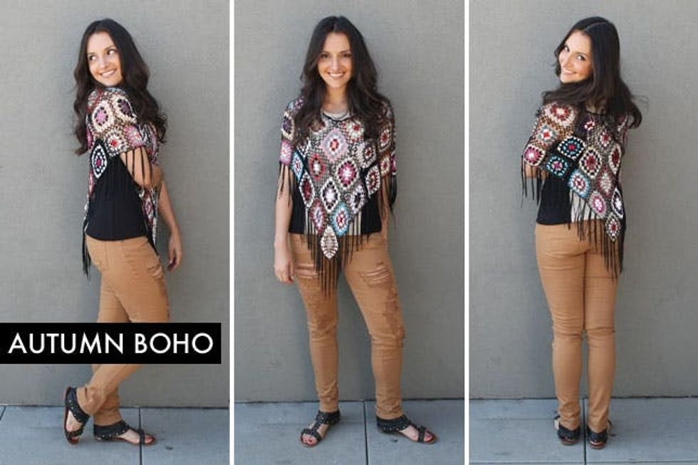 Feeling a little more casual? Roll up your dress so its more like a tunic, pair of a worn out pair of jeans, sandals, and a colorful crocheted poncho. Effortless style.