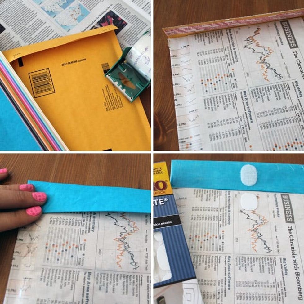 To create this case, we used a padded envelope, packing tape, and a touch of VELCRO® Brand Sticky Back Tape. Paste newspaper onto the envelope, then add a stripe of color for the envelope flap if you like. Now, cover the whole thing in clear packing tape to make it extra strong. Then add VELCRO® tape. Done!