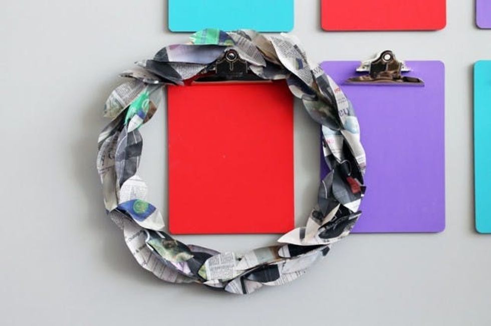 We used a wreath ring but you could also use a piece of cardboard. Cut out a bunch of newspaper leaves and glue onto the ring using hot glue. So easy and surprisingly stylish.