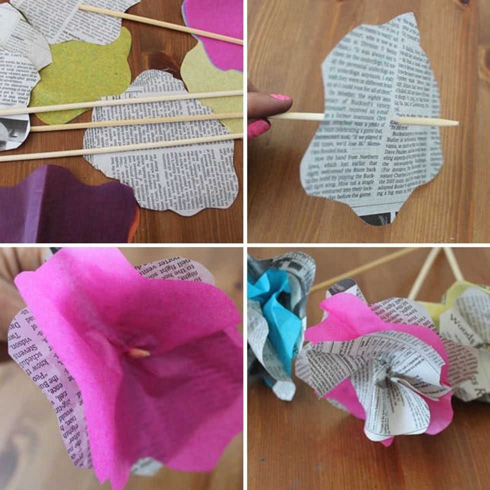 Cut out a bunch of flower shapes. Press a wooden stick or dowel through the center and keep layering until you’ve got a fullness you like. Repeat for as many flowers as you like!