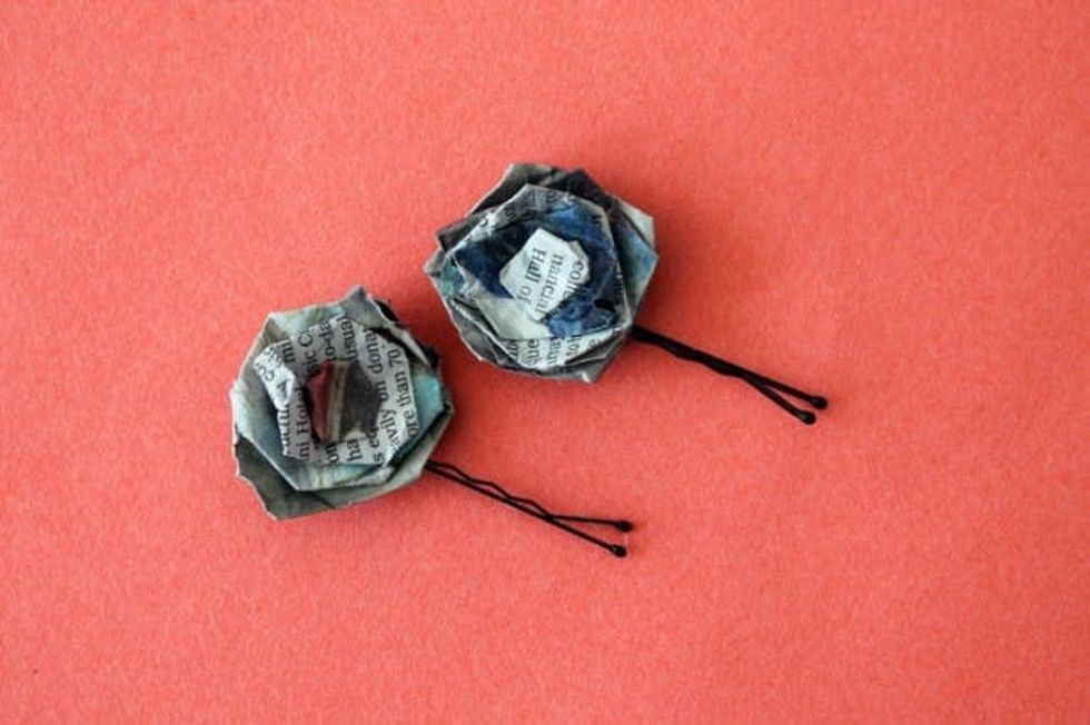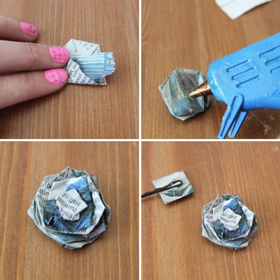 These are a sweet way to add a little spice to your do! Simply create a bunch of little triangles and layer them into a rose shape using hot glue in between each layer. Attach to a bobby pin and let dry. See also: Duct Tape Rosettes.