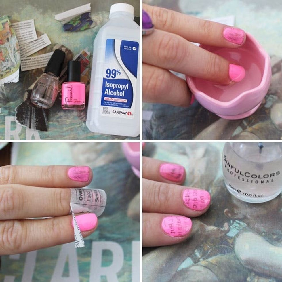 To create your own newspaper mani, all you need is rubbing alcohol, nail polish, and newspaper. Paint your nails with a base coat – this can be a clear or a light color. Once dry, dip your nails in rubbing alcohol. Now press newspaper onto each nail. Peel off and you should have a newspaper transfer on your nail! Cover with clear polish to seal the deal.