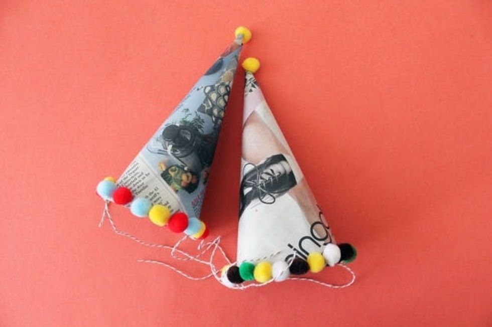 Turn newspaper into party hats by rolling it into cones. Use tape to secure and then add pom poms or trim using hot glue. Excellent!