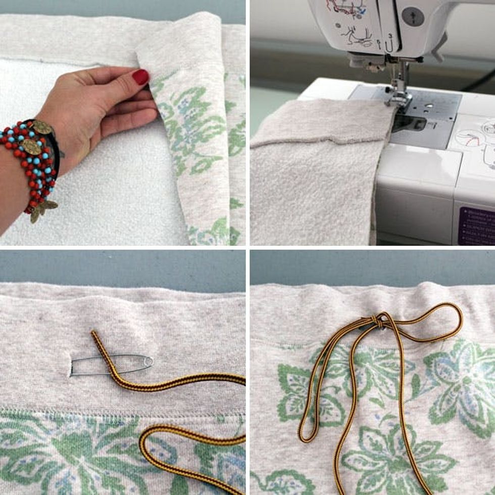 Turn your sweatshirt upside down. The band at the bottom will become your waistband. Cut off the sleeves and neck so that you have a rectangle. Sew! Use scissors at the top to make holes to put in a drawstring. String in the shoelace and you’re done.