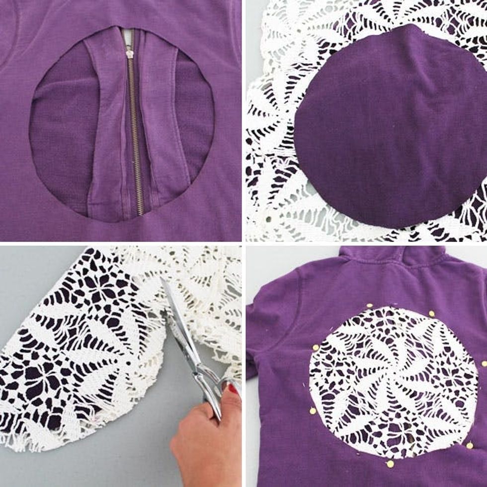 First thing to do for this one is to cut a hole out of the back of your hoodie. Use a plate or bowl to trace the shape. Take out the cut-out piece of sweatshirt and trace a circle onto your lace fabric. Cut about 1/2 in inch larger around the circle (so you have space for stitching). Pin the lace piece to the inside of sweatshirt and sew!