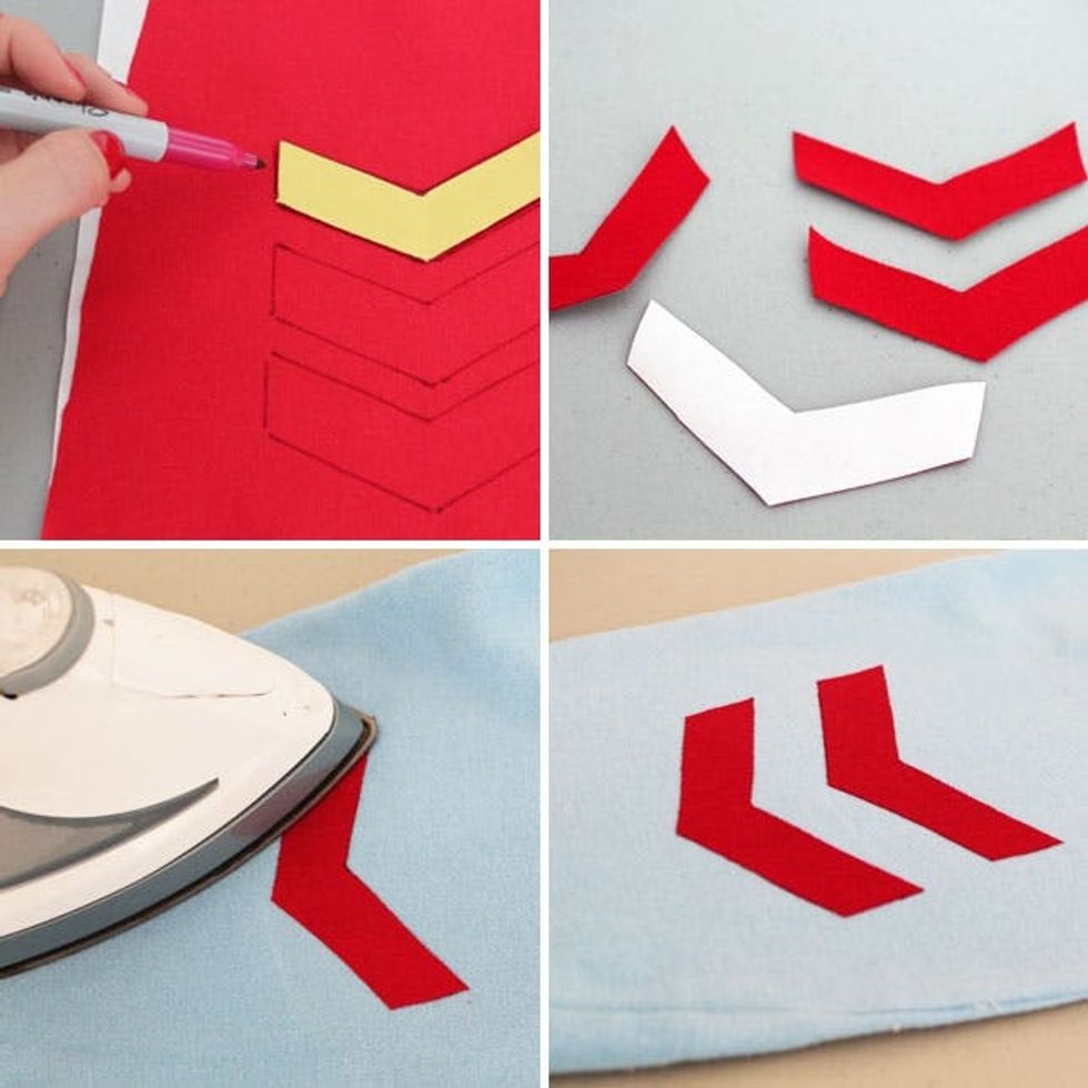 Grab some contras tic fabric. Iron it onto fusible web (to create iron-ons). Trace whatever design you like. and iron onto the elbows of your hoodie. Pro tip after making our hoodie: Put on your hoodie and mark where you elbow actually hits :)