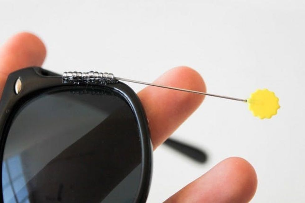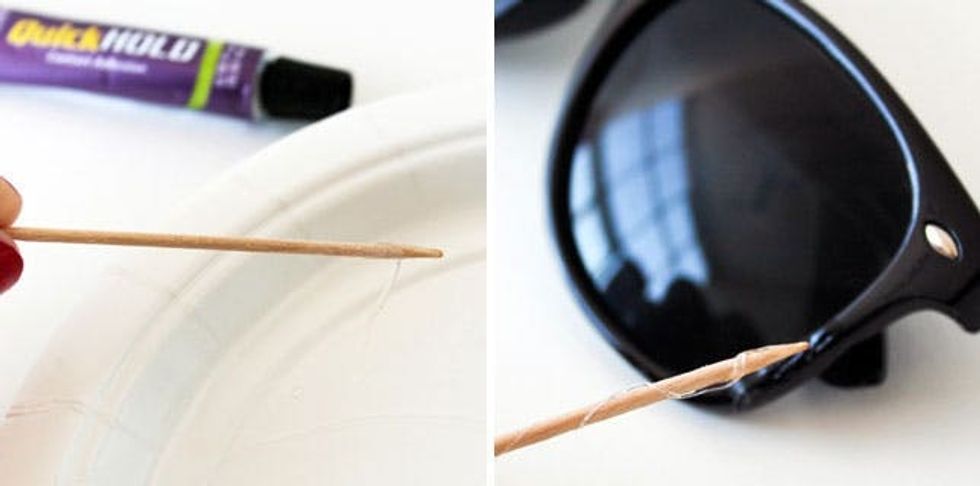 Squeeze a bit of glue onto a paper plate and use a toothpick to apply it to your sunglasses.