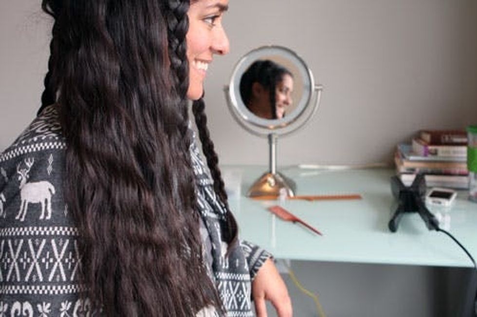 Next, braid! Then take your flat iron and iron the braids one by one. It's crucial that you start all the way at the top of the braid, and hold in place for about 10 seconds.