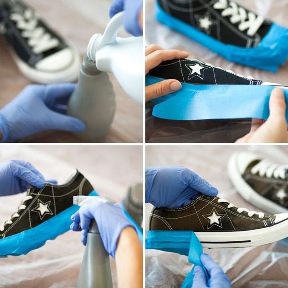 Fill a spray bottle with 1 part bleach, 2 parts water. Tape the sole to protect it. Then simply spray! You’ll want to get closer and farther away from the shoe for variation of pattern.