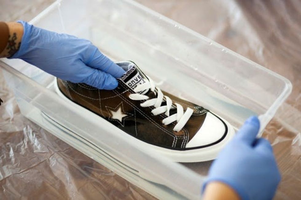 Again, remove the tape and dunk your shoe once the bleach has created a color and pattern that suits you.