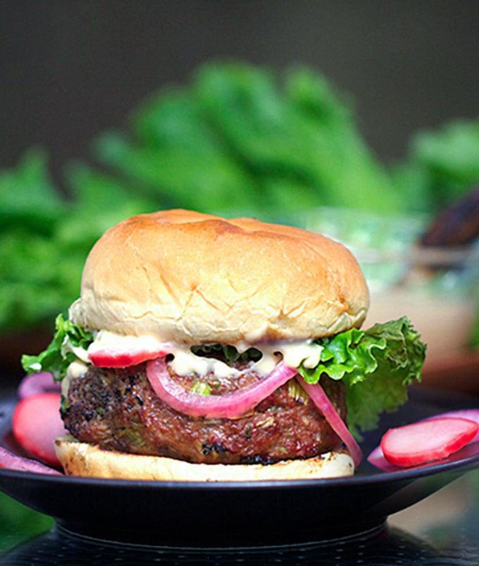 3. Korean BBQ Burgers with Pickled Radishes, Onions, and Miso Mayonnaise: To get these burgers started, ground beef is mixed with scallions, soy sauce, brown sugar, sesame, ginger, and garlic. The patties are topped with a miso-sriracha mayo and sharply-pickled vegetables — a bright alternative to cheddar and ketchup. (via Panning the Globe)