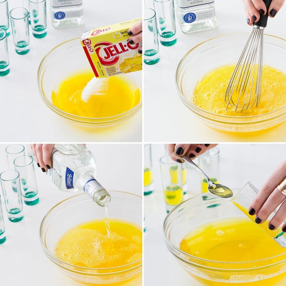 1. Combine lemon Jell-O and 2.5 cups hot water in a large bowl. Stir. Add 1.5 cups tequila. Stir. Use a spoon to fill your shot glasses 1/3 of the way. Place in the fridge to set for 60-90 minutes.