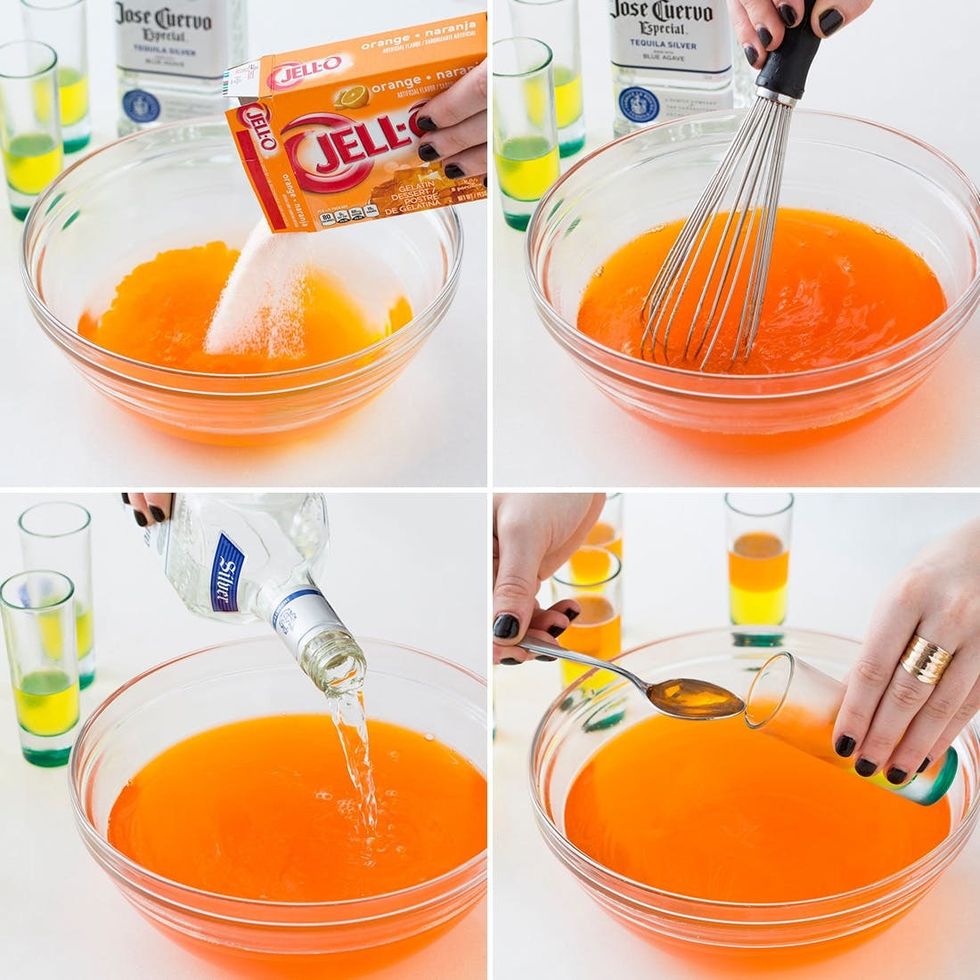2. Combine orange Jell-O and 2.5 cups hot water in a large bowl. Stir. Add 1.5 cups tequila. Stir. Use a spoon to fill your shot glasses 2/3 of the way. Place in the fridge to set for 60-90 minutes.