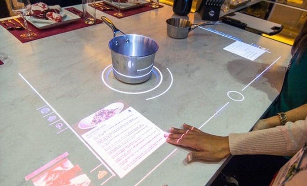 1. Whirlpool Touchscreen Stovetop: First up, iconic kitchen brand Whirlpool has demonstrated a kitchen concept that includes an interactive touchscreen cooktop that can display recipes, social media updates, news, weather, and more… like a smartphone right on your countertop. The entire thing can be voice controlled if need be, meaning you can ask questions about a recipe out loud and the like. The stovetop itself would use induction heat for cooking, and the end product would be a large tablet-like mat that you could place on any surface. It’s still about five years out, but we dig this type of interaction in the kitchen.