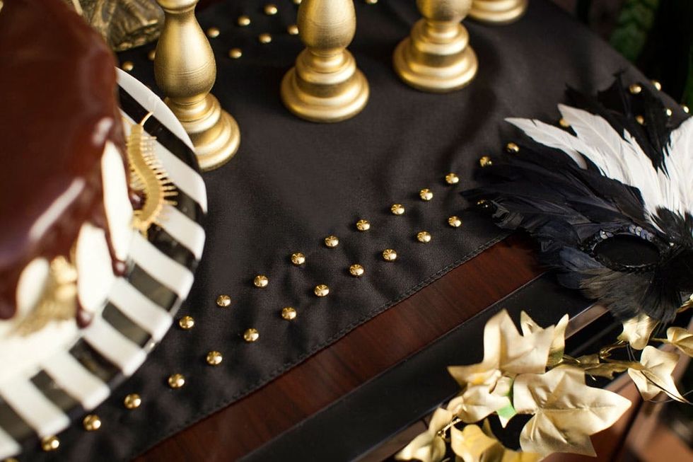 6. Studded Table Runner: Take a simple black table runner (or even a piece of fabric) and jazz it up by adding studs along the top and bottom borders. It’s a small touch but makes the whole party scene more official.
