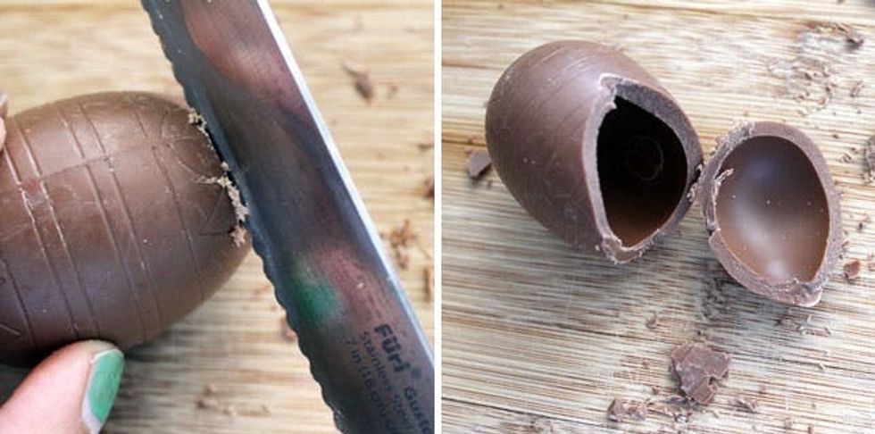 Use a serrated knife to “crack” your egg. You want to cut very slowly, allowing the chocolate egg to crack naturally. This makes for the cleanest cut.