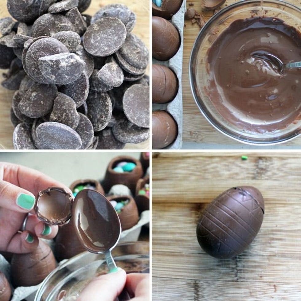 To seal your eggs back up, it’s time to melt some chocolate. We used chocolate candy melts. Microwave melts at half power for a minute, then in 30 second intervals until you have a good “glue-like” consistency. Use the bottom of a spoon to spread the melted chocolate onto the cracked top of each egg.