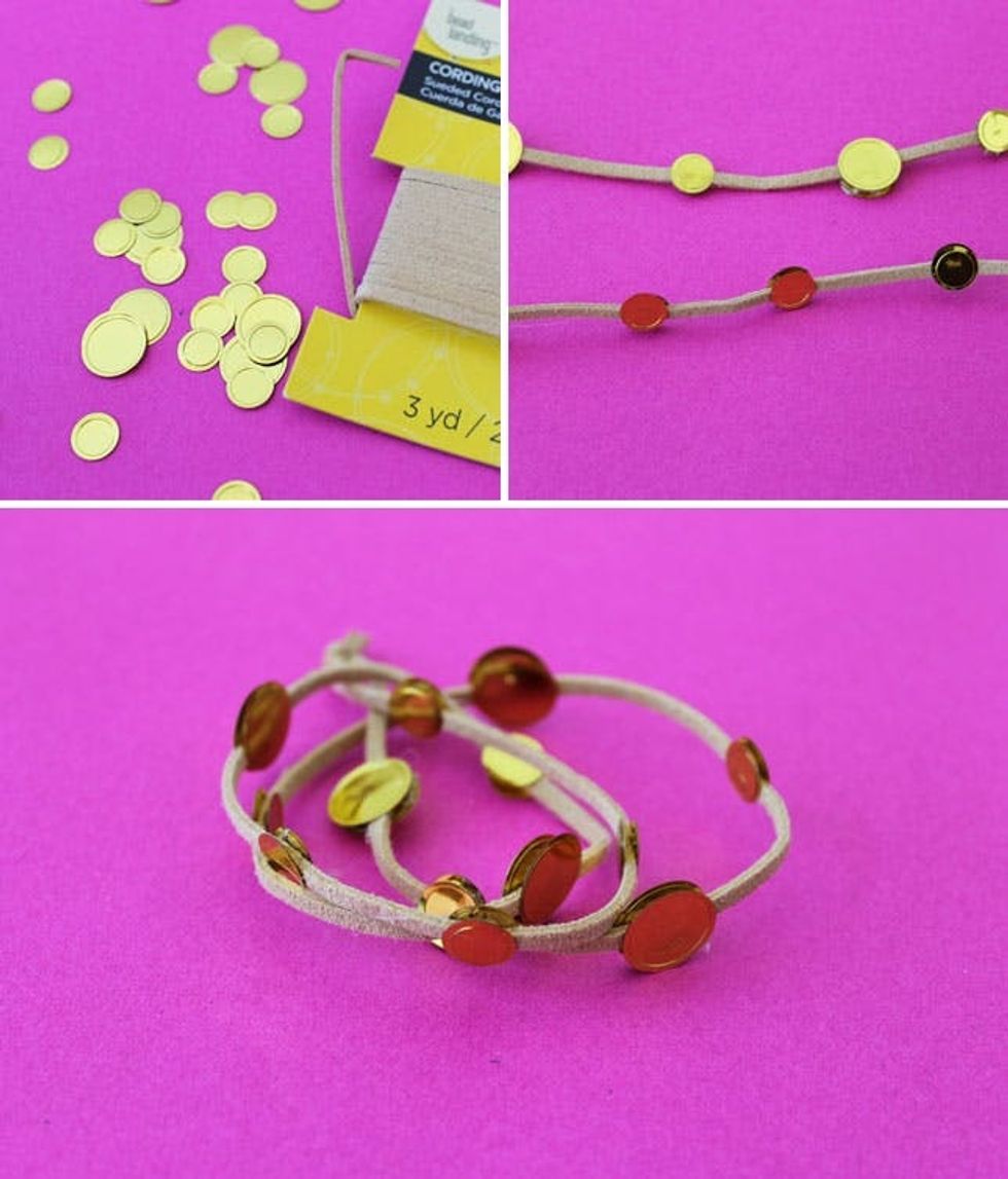 8. Confetti Wrap Bracelet: Hot glue and beige leather cord come together beautifully in this wrap. (Scroll up to the headband to see another shot of the wrap bracelet in action.)