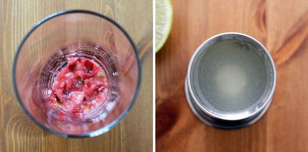 Next, add a little bit of lime juice and simple syrup. You want about a teaspoon of each.