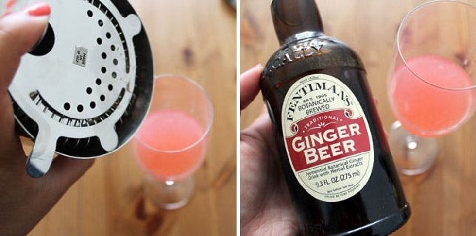 Use a strainer to pour into a champagne flute. Add ginger beer, and you’re almost done!
