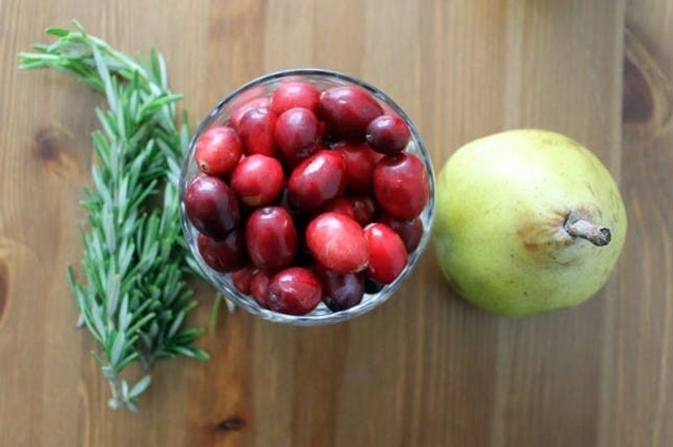 First, we’ll get our muddle on. Each drink takes 4-5 cranberries and a few slices of pear. Muddle those fruits up.