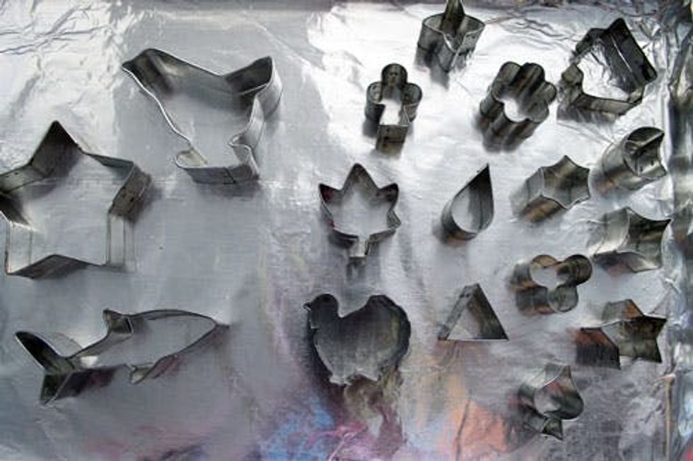 To prep your cookie sheet and cutters, place aluminum foil over the cookie sheet. Spray with cookie spray or use a paper towel to cover with a thin layer of vegetable oil. Do the same on the insides of each cookie cutter.