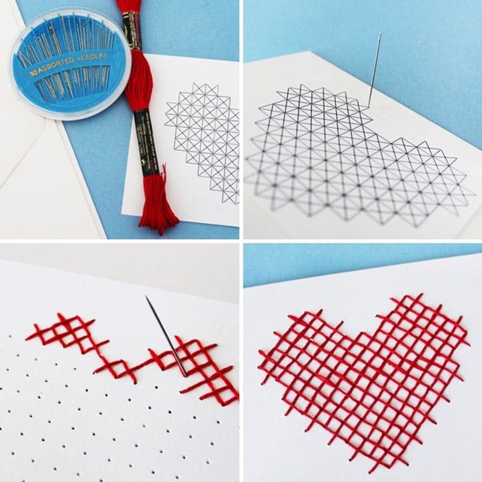 First, print out your heart template (available here). Tape it on your card and use a needle or push pin to poke holes through the front side of the card. Then take your needle and embroidery floss and start stitching! Pull the needle through the holes you’ve created, and create a series of X-shaped stitches, also known as cross-stitch. Tie a knot on the inside of the card when you’ve reached the end, and you’re done!