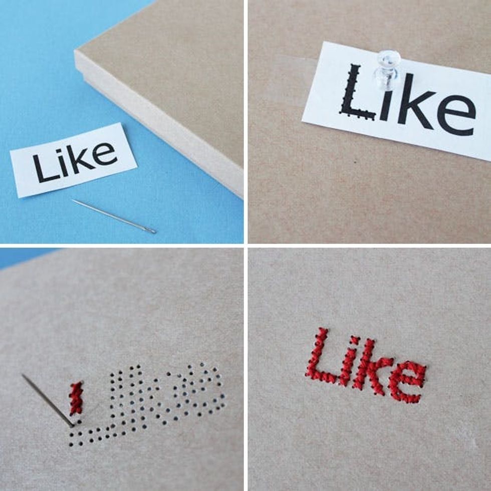 Inspired by the Facebook Like button, this box is a cute way to tell that special someone you like ’em! Print out a template (available here) and tape to your box. Again, use a push pin or needle to poke holes through the box, around the outline of each letter. Cross-stitch it up, and you’re done!