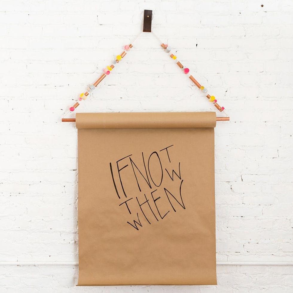With January comes that spurt of motivation we all want and need to get more organized and be more productive. For us, having an inspirational space that we can see throughout our day is the best reminder to stay motivated. That’s why we made this awesome wall note roll to give us just that — a place to write our inspirational messages, to-do lists, favorite puns and even Pictionary drawings. We were really excited about making handmade beads and were drawn to how copper (we’ve been really into copper accents lately) meshed with neon colors, so we put the two together for our project. The process was incredibly fun — who doesn’t love drilling, hammering and spray painting?! Let’s get to it!