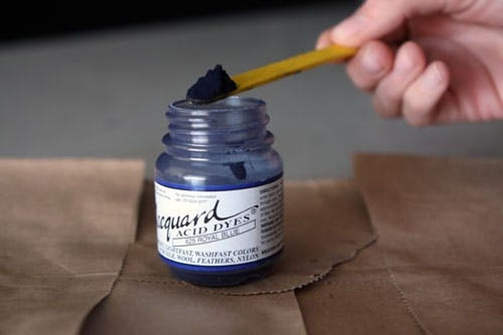 Add about half a teaspoon of acid dye. We used a popsicle stick and eyeballed it. Add it to the water and let heat for 2 minutes.