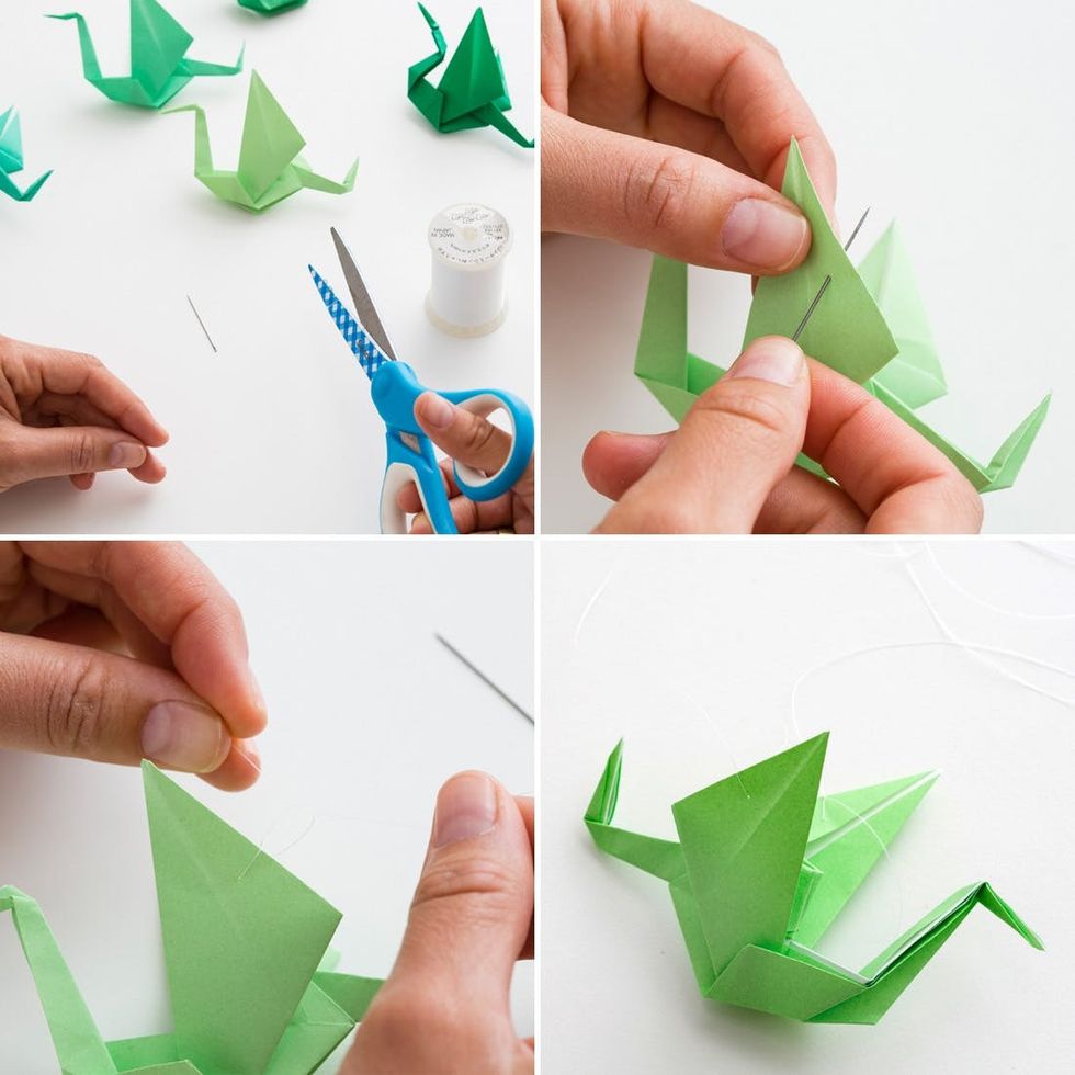Instructions: 1. Spray paint your branch gold, or any color you like. 2. Make storks using gray and white origami paper. 3. Use a needle and gold thread to string the storks and hang them on the branch at different heights.