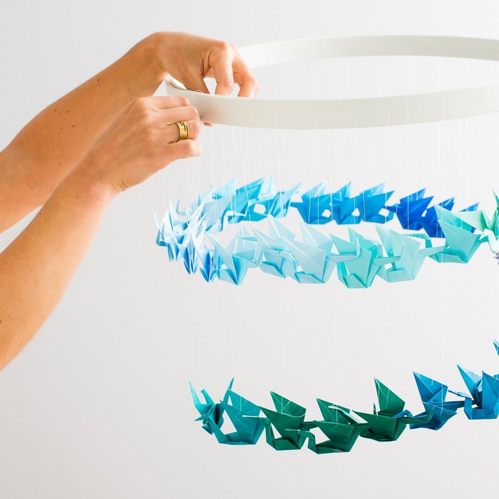 Organize your origami paper in an ombre color pattern. Make storks! Then, use a needle and thread to string the storks and hang them on the hoop.