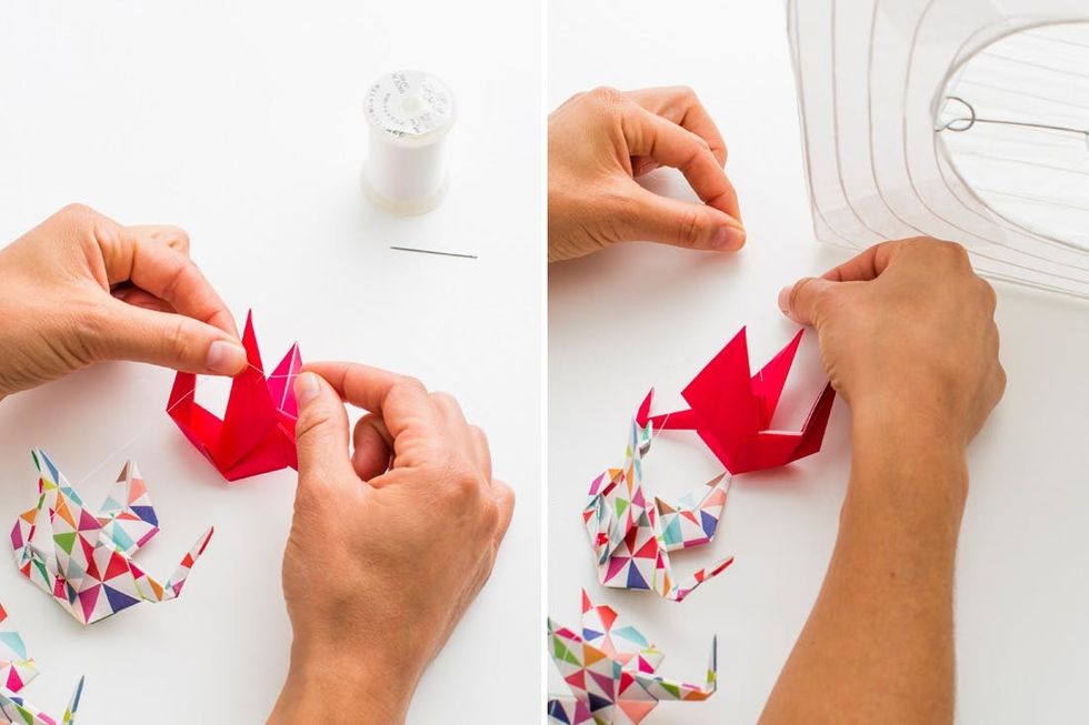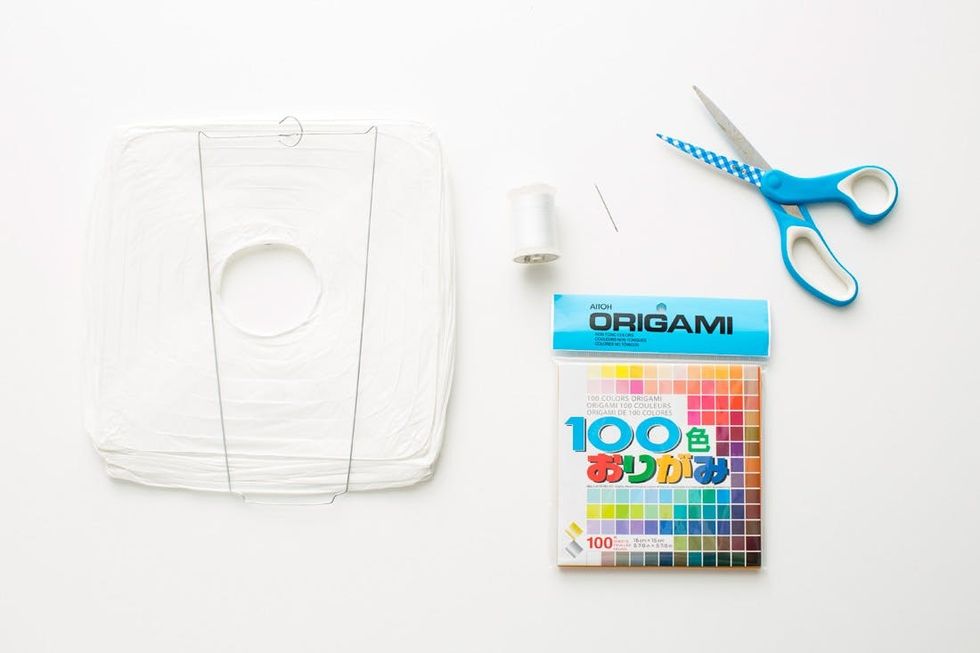 Materials: – square paper lantern + pendant light kit – origami paper in colors of your choice – needle + thread – scissors
