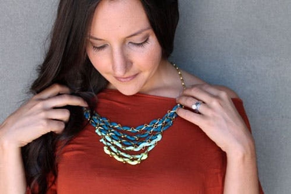 To thread the spandex through the chain, use a piece of tape to create a needle at one end of the spandex, kind of like the end of a shoelace. Tie one end of the spandex as far down as you want the color to start. Thread through as long as you'd like for the first tier. We went with 11 inches centered at the bottom of the necklace.