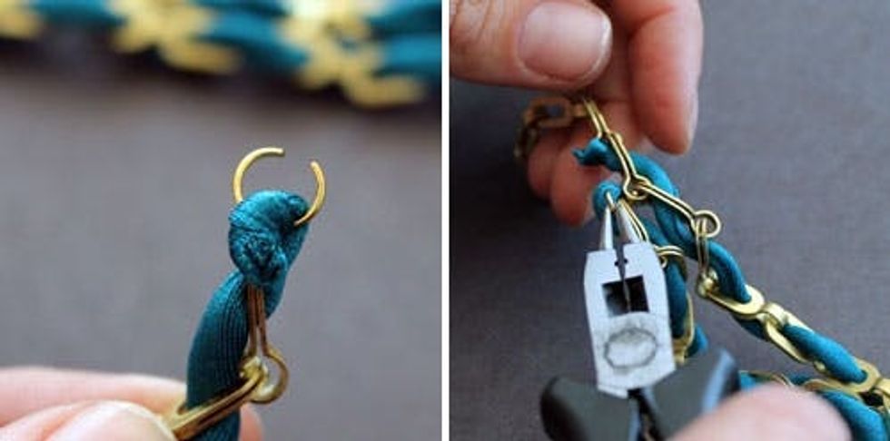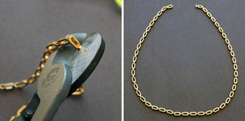 We were so inspired by the combination of chain and brightly-colored spandex from Tuesday's chunky necklace hack that we created another little something. Again, all you need is chain, spandex, and needle nose pliers to make your tiered ombre necklace dreams come true.