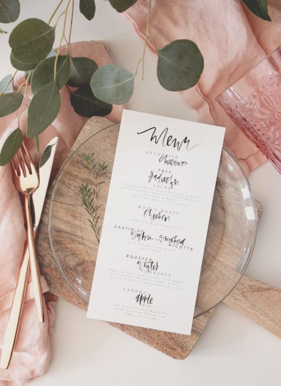 2. A Fabulouse Fete Watercolor Brush Calligraphy Menu ($200): A minimalist menu will totally stand out against pale pink accents without overpowering the hue. Plus, some fab calligraphy never hurts.
