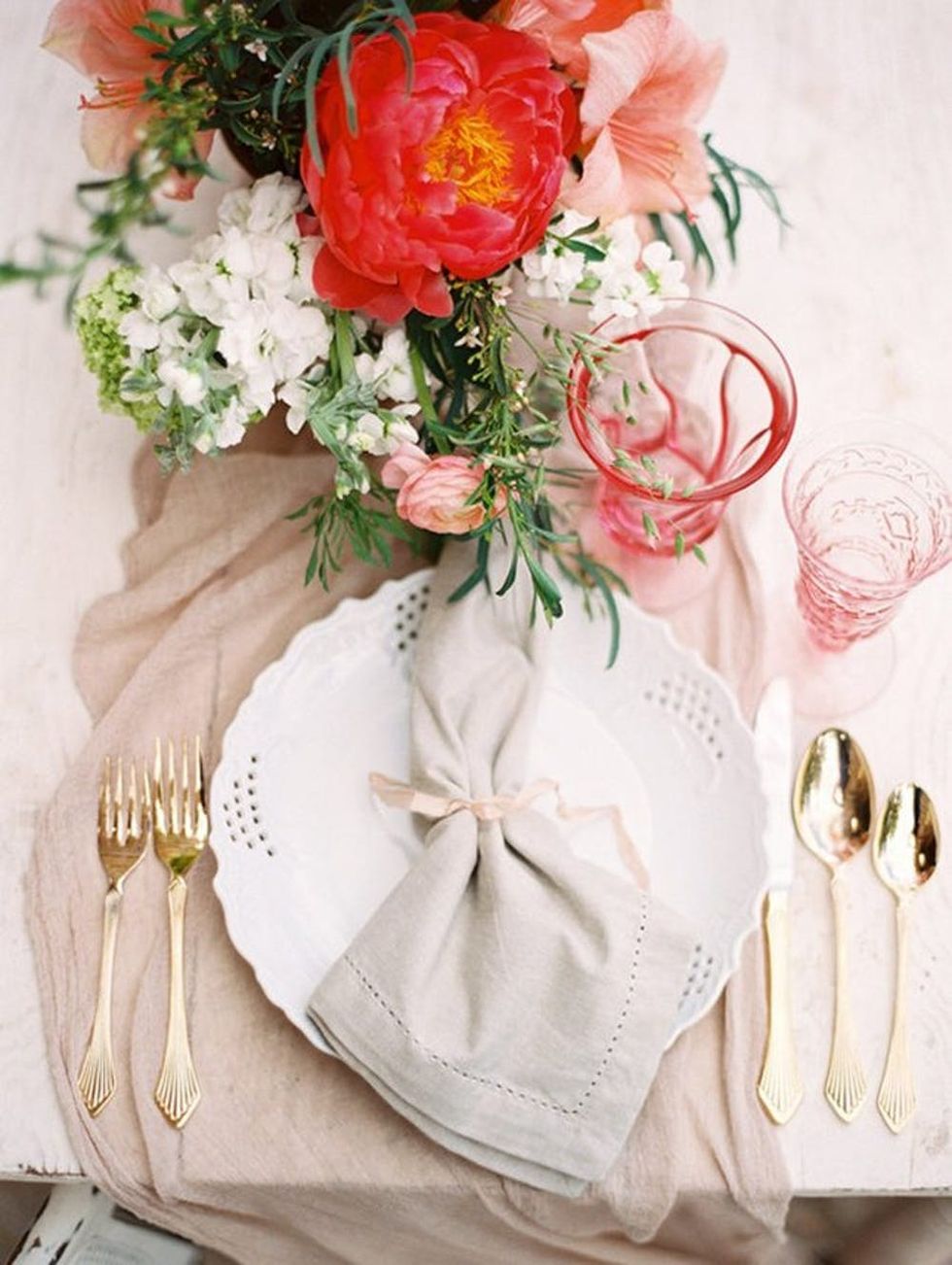 4. Bold and Bright: If all-pastels isn’t quite your jam, pair dusty rose with golden accents and vibrant blossoms. (via Charla Storey / 100 Layer Cake)