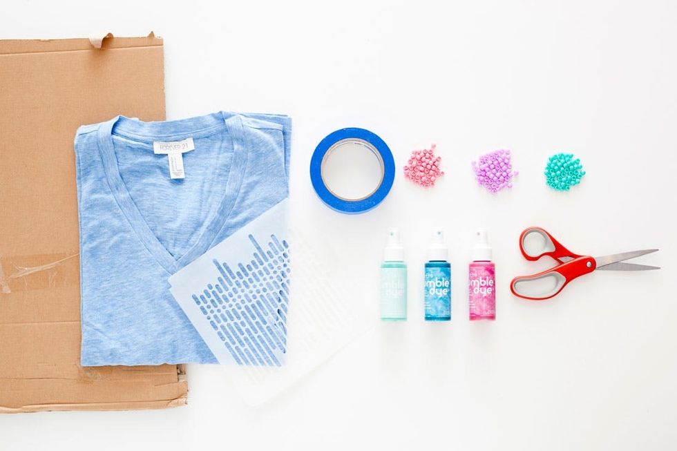 First, pull your t-shirt over a piece of cardboard. This will ensure the design doesn’t bleed through to the back of the shirt. Place your stencil using painter’s tape. Then spray! We recommend holding the spray bottle about a foot away from your shirt — otherwise the dye tends to bleed. Let dry and peel off the stencil.