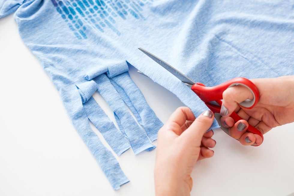Now, time to make that fringe. Cut off the bottom hem of your t-shirt, then cut strips from the bottom about a quarter of the way up in 1/2 inch strips.