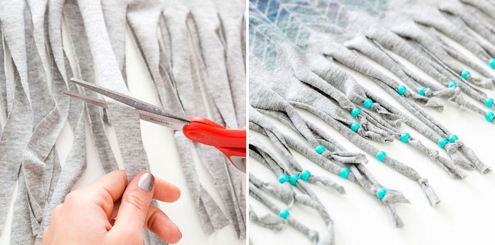 6. Place beads on the fringe strands and then knot the fabric to secure.