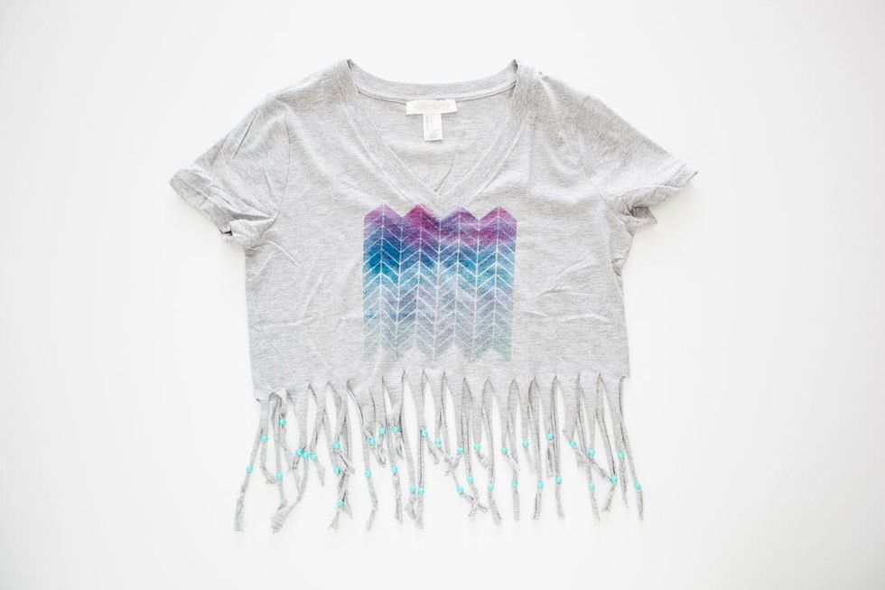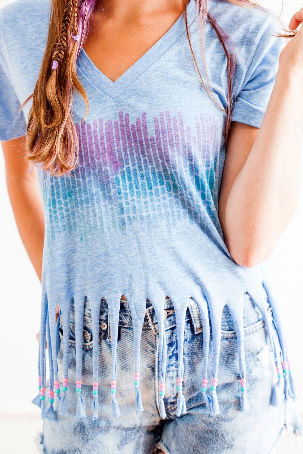 We did the same thing with a gray t-shirt, but created a high-low look by making the fringe in the front higher than the back.