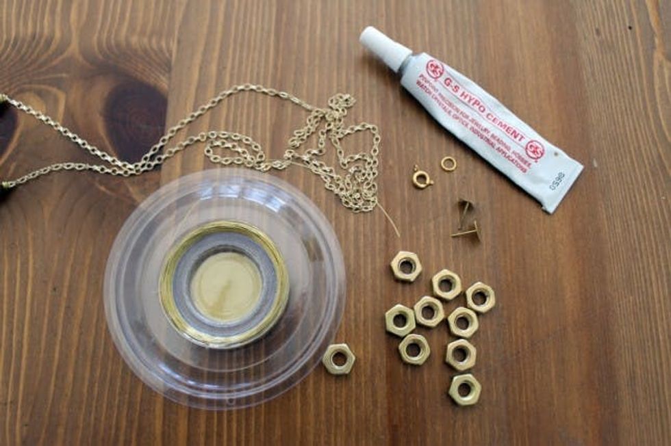 When thinking about holiday style, we’re all about glitter and gold. We showed you how to glitter your oxfords, your heels, and your button downs, and now it’s time to go for the gold. For today’s holiday bling, our main star is a box of hex nuts from the hardware store. With just a few simple tools, we created a pair of gold studs, a bracelet, and a sweet statement necklace all using hex nuts!