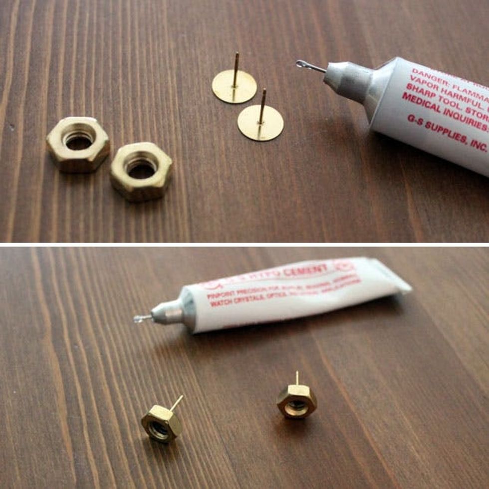For the earrings, simply glue a hex nut to each post, let dry, and you’re done.