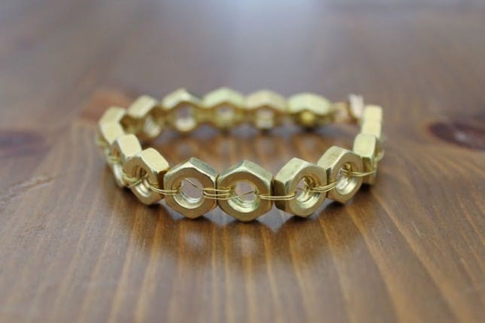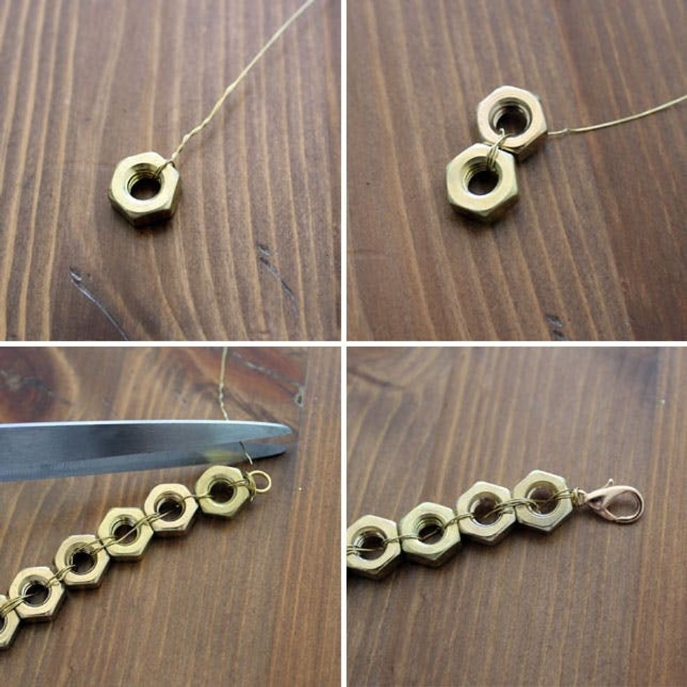 For the bracelet, use wire to attach hex nuts to each other. Then add a clasp! Best of all if you make it a size too big, you can easily take out a hex nut as needed.