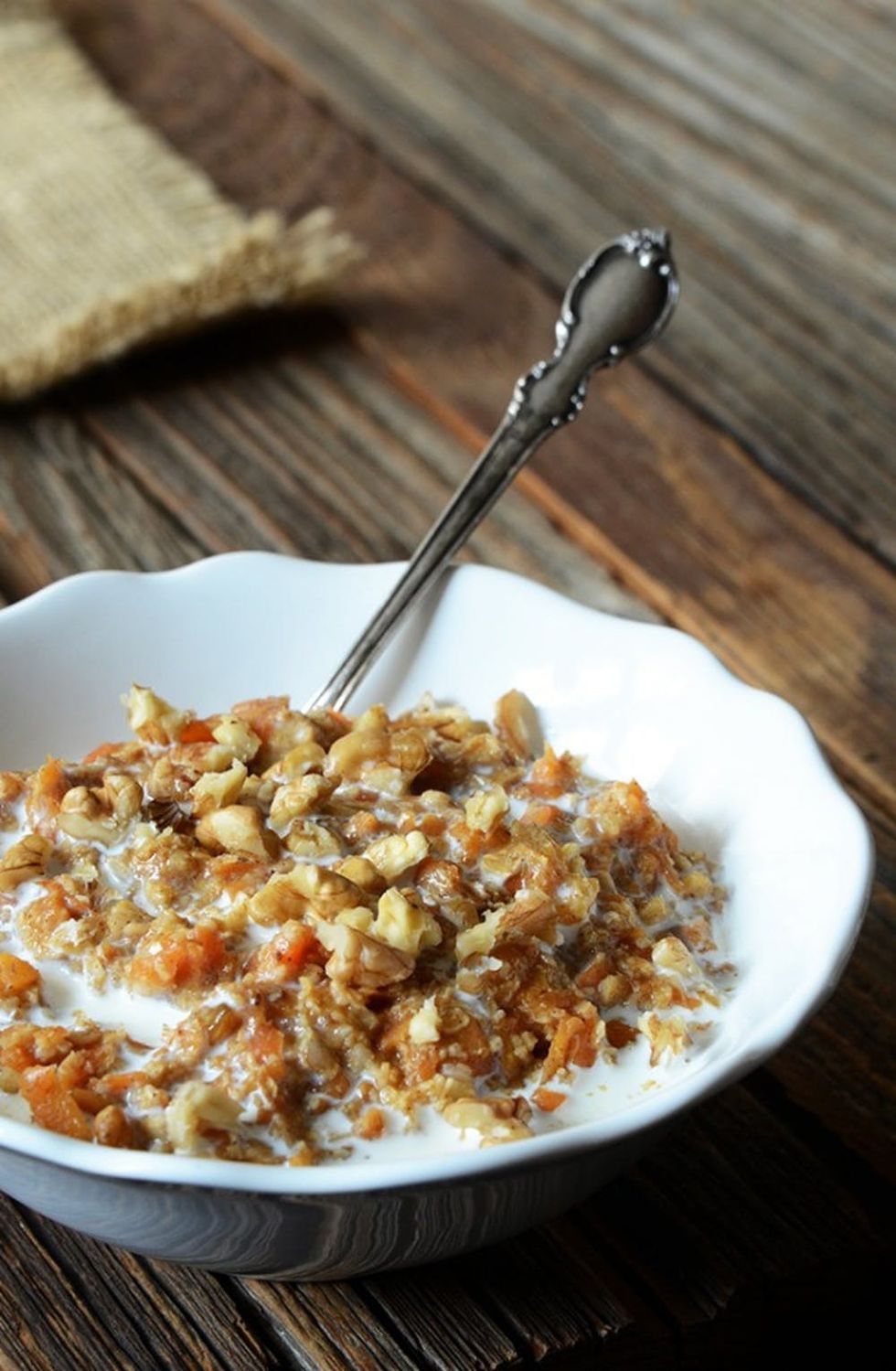 Turn cake into a healthy breakfast with this recipe. Shredded carrots, walnuts and coconut are all mixed together to make a delicious breakfast that gets you a serving of veggies, too. (via An Edible Mosaic)