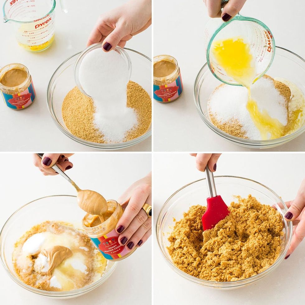 Preheat oven to 350 degrees F. In a large bowl, combine the graham cracker crumbs, sugar, melted butter and Dylan’s Candy Bar Honey Graham Cracker Spread. Mix to combine.